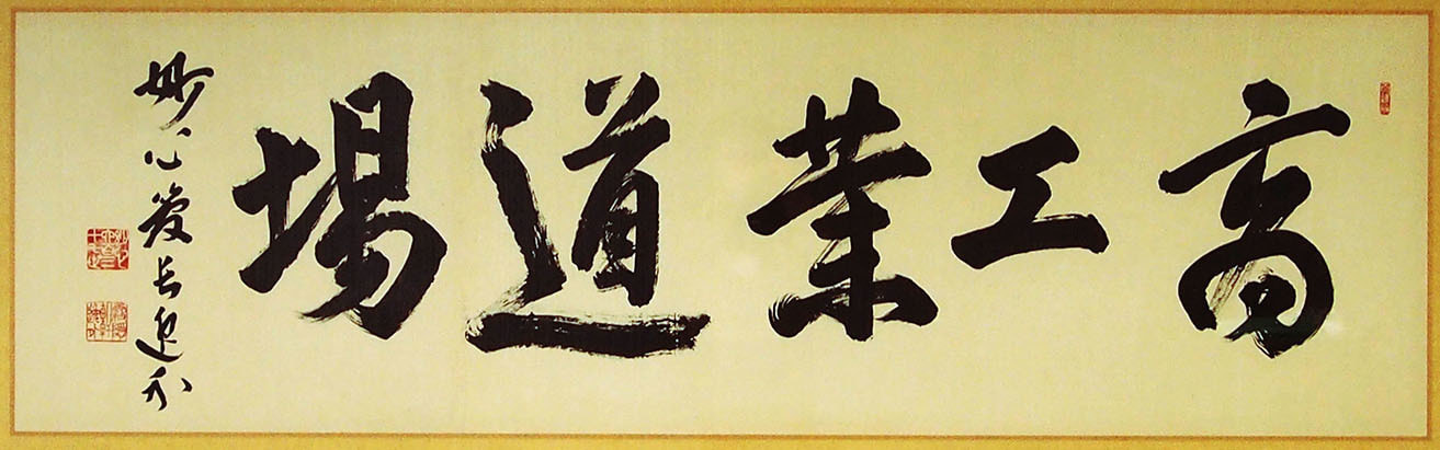 かつて、縁あって当社を訪ねられた京都妙心寺(臨済宗派の大本山)の管長が、ここには、物を売る「商」(あきない)と造る「工」(たくみ)を「業」(なりわい)とする者が学ぶ場であると言われ「本書」を揮毫されました。以来、会社と各工場にこの書を掲げ「人が学び育つ場」「常に最高を目指す」励みとしております。