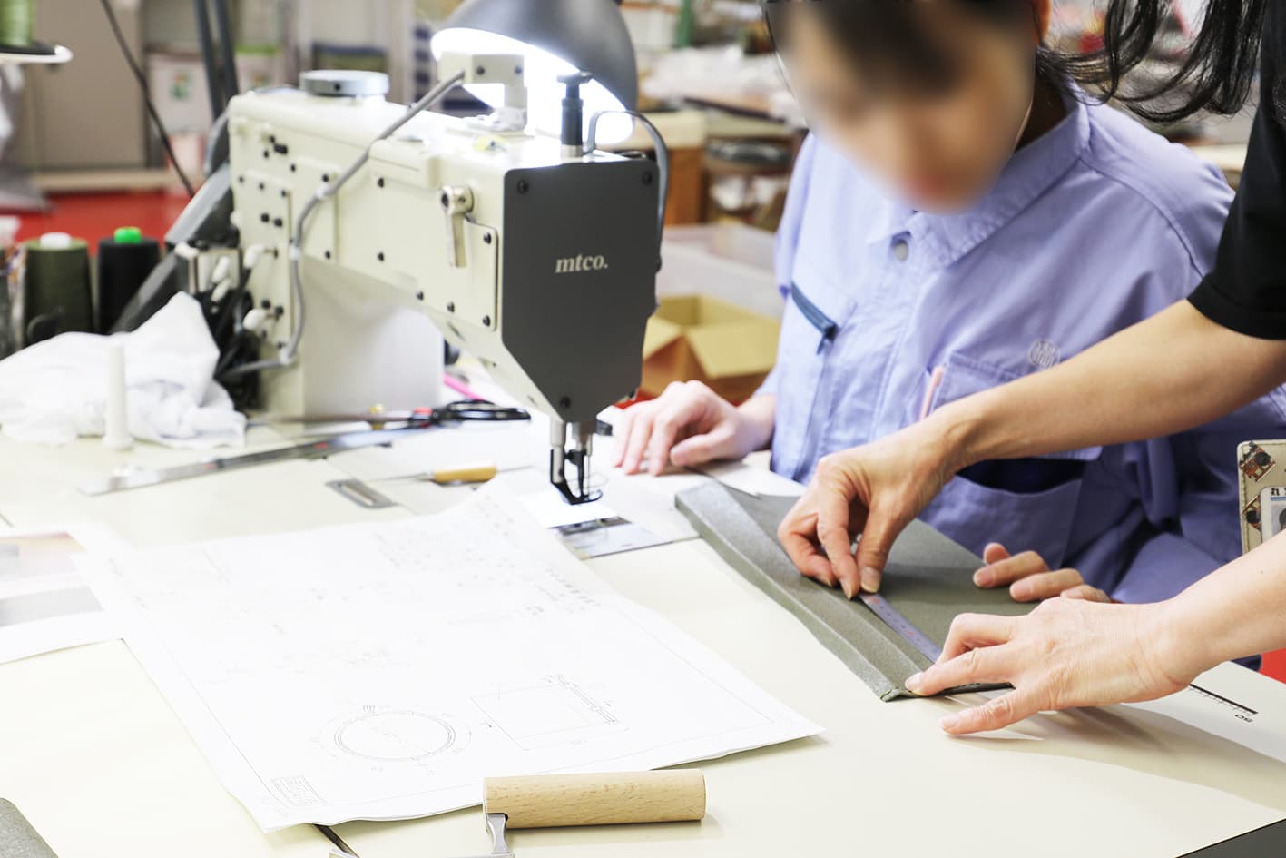 丸満産業では未来の人材のための垣根をとりのぞき、先輩も後輩も常に作業場はフラットな関係を推奨しています。新しい考え方や方法は意外にこんなところから生まれます。垣根を取り除くことで国境や人種も越え、どの工場でも全員が笑顔で作業できるのです。先輩も新人から教えられることが多いにあり、お客さまのために、最高の製品のために、自らが笑顔であること。ミシンの隙間からのぞく笑顔、会話。それらすべてが丸満産業を育てる原動力なのです。