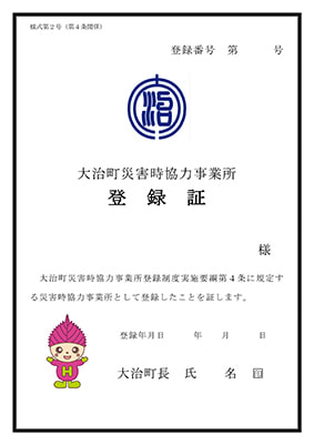 丸満産業本社は所在地の愛知県海部郡大治町の「大治町災害時協力事業所登録」第1号です。