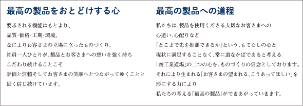かつて、縁あって当社を訪ねられた京都妙心寺(臨済宗派の大本山)の管長が、ここには、物を売る「商」(あきない)と造る「工」(たくみ)を「業」(なりわい)とする者が学ぶ場であると言われ「本書」を揮毫されました。以来、会社と各工場にこの書を掲げ「人が学び育つ場」「常に最高を目指す」励みとしております。