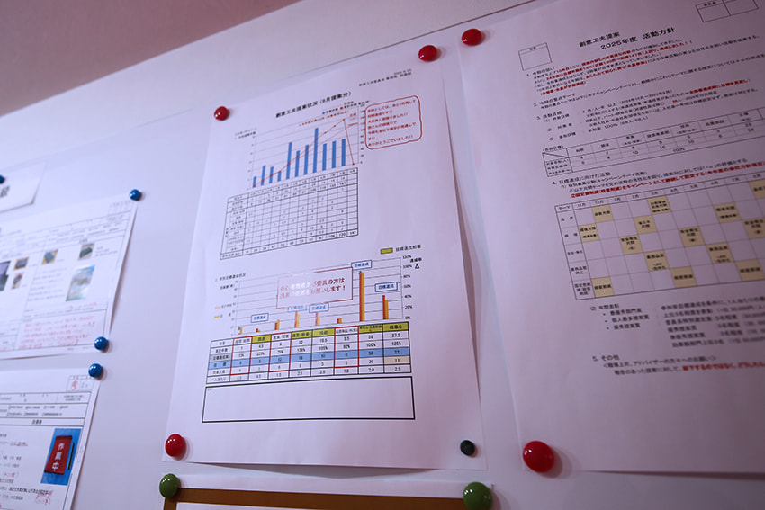 すべての社員が自ら考え行動できるように「創意工夫」活動を気付きの場としています。 この「創意工夫」は、社員一人ひとりに広い視点で取り組んでもらうために大きな制限を設けていません。今日より明日、良くなれることを、日常の業務を通じて考え、提案し、その評価を行っています。 「常に人を育む」こんな取り組みが社員の未来にきっとつながると信じています。また社内にはそんな提案や目標、発見を掲示する壁面があり、誰でもいつでも閲覧できるようになっています。